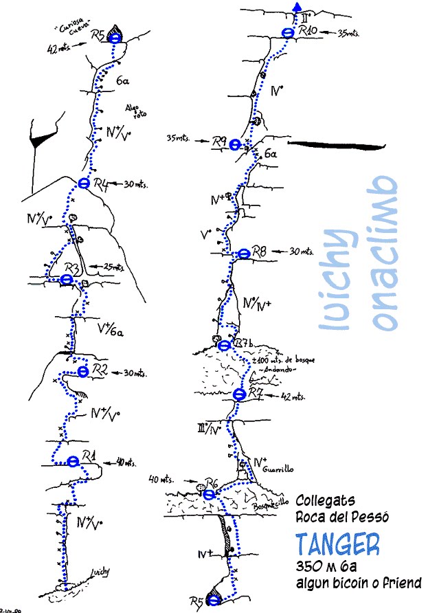 Recupero la topo publicada a la que va ser una primera guia de Collegats de la mà de l'artista Ballart ja fa anys. Els 6c i 6b s'han convertit en 6a's (que com diuen les piulades, es fan molt bé en Ao) tot i que a les 100 millors es conserva el 6b on deia 6c. En canvi, molts dels graus baixos es podrien pujar. Sembla com si convisqués una graduació original clàssica amb una d'esportiva als trams difícils que es devien alliberar a posteriori i de-cotar després (???).